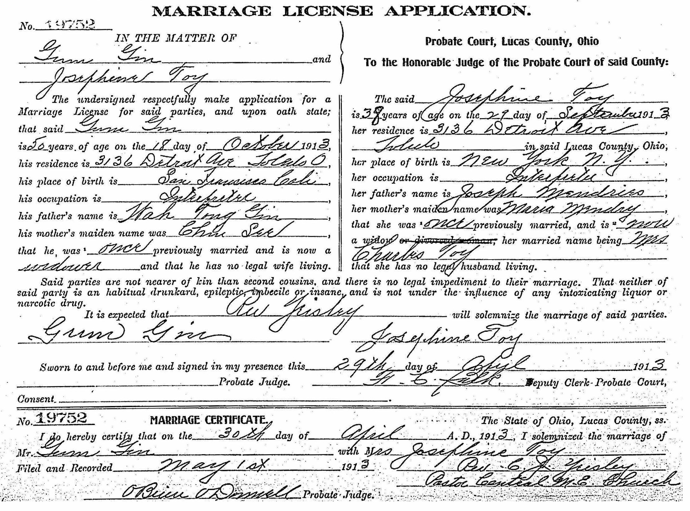 married in Ohio in April 29, 1913, as this certificate