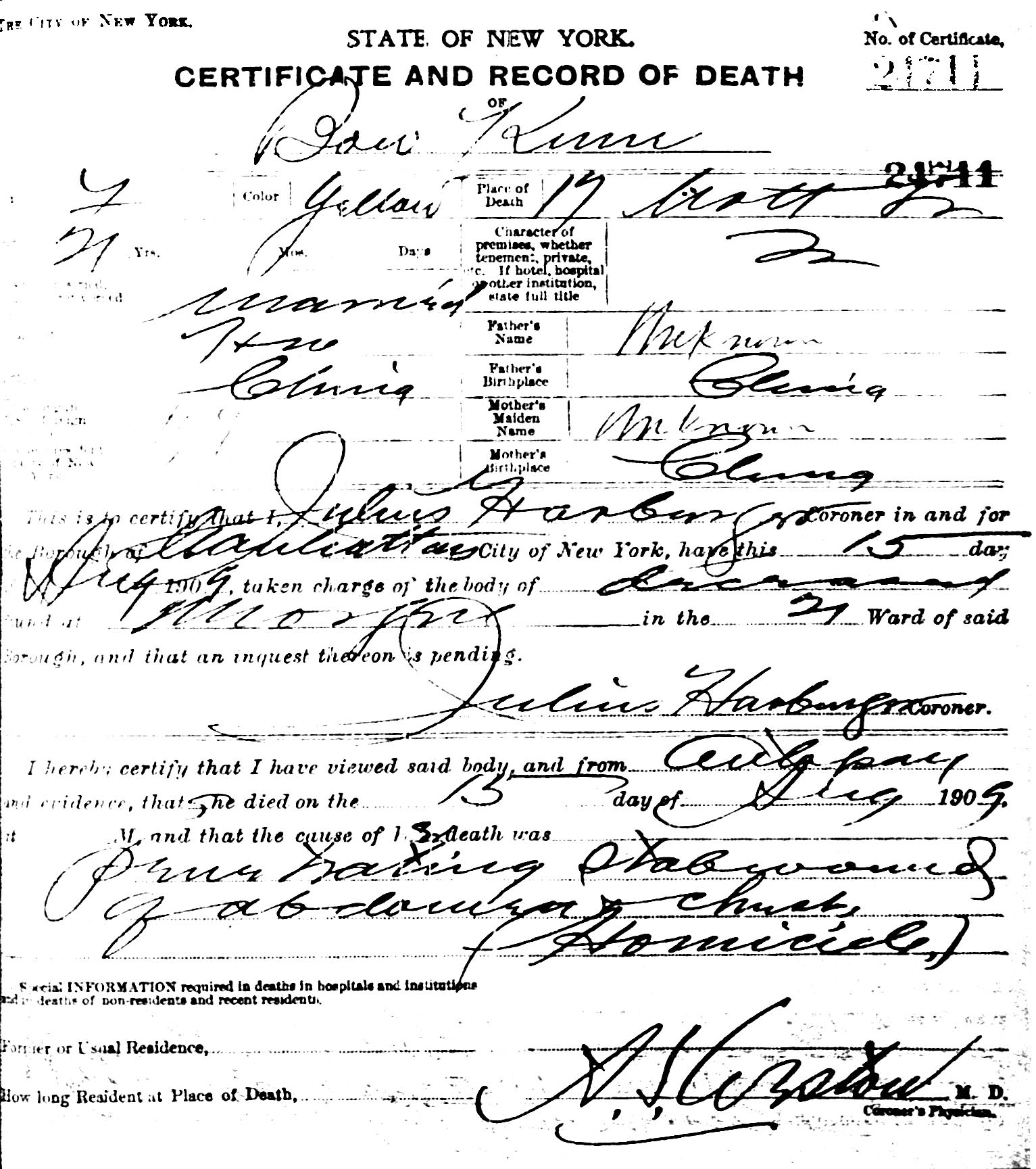 Kum's official death certificate, which lists her cause of